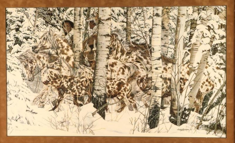 By Judy Larson, entitled "In the Company of Wolves" Limited edition 90 of 250, with artist proof, hand signed in pencil, and signed with marker on glass. Image size 26x15" Includes certificate of authenticity from Jack Appleman publisher.