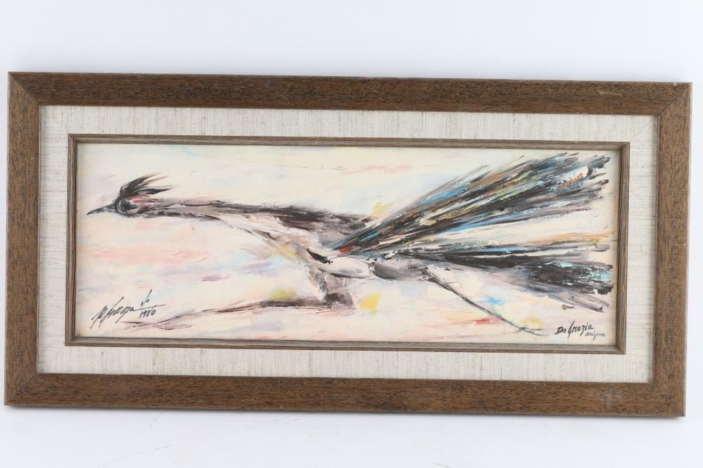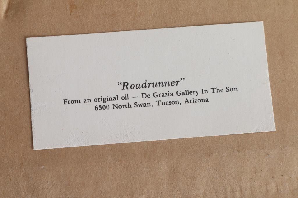 By Arizona artist "De Grazia" entitled "Roadrunner" dated 1980, signed bottom left. Measuring 16x6.