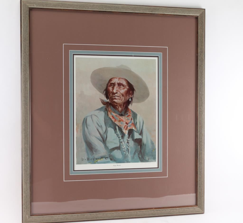 By Noted Western Artist Olaf Wieghorst. Depicting Indian portrait. Triple matted and framed, signed in pencil lower right hand corner. 20 x 14".