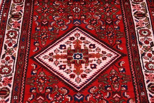 Fine artistic Persian geometric Malayer runner, size 3.7 x 10.4 feet, made of fine quality lambs wool pile on cotton foundation, all natural vegetable dye, the colors and patterns are rich and varied. Like all of the most artistic village rugs. Hand woven in Malayer, Iran. Antique Malayer rugs are excellent investments. Regional weavers generally produced smaller area rugs and runners although larger room sized rugs were created on commission. Richness of motifs makes antique Malayer rugs endlessly fascinating.