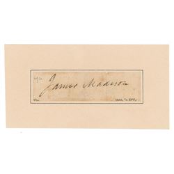 Ink signature, "James Madison," on an off-white 3.25 x 1 slip, professionally inlaid into a slightly larger card. In fine condition, with ...