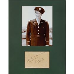 Vintage fountain pen signature and inscription, "Good luck to the University of Maryland Unit, Ronald Reagan, 2nd Lt. Cav.,” on an off-wh...