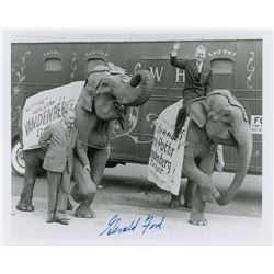 Playful satin-finish 10 x 8 photo of the young Ford riding an elephant, signed in blue felt tip, "Gerald Ford." In fine condition.