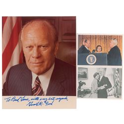 Three photos: a 5 x 3.5 photo of the Fords in the Oval Office, signed in black felt tip, "Gerald R. Ford" and "Betty Ford"; a co...