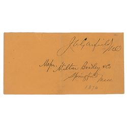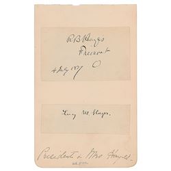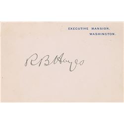 Official Executive Mansion card, signed in ink, "R. B. Hayes." In fine condition, with faint soiling, and old mounting residue on the reve...