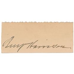 Ink signature, "Benj. Harrison,” on an off-white 3.25 x 1.5 card. In fine condition, with some light surface impressions in the upper blank are...