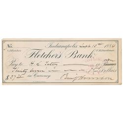Fletcher's Bank check, 7.25 x 2.75, filled out and signed by Harrison, payable to H. L. Tetaz for $37.75, September 15, 1884. In fine condition....