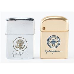 Two Lyndon B. Johnson lighters: a champagne-colored Bowers Sure Fire lighter, marked in blue with the vice presidential seal and Johnson's facsi...