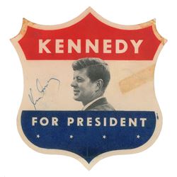Patriotic decal from JFK's 1960 campaign for president, 6 x 6, signed in blue ballpoint by John F. Kennedy. In very good to fine condition, with...
