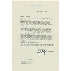 TLS as president, one page, 7 x 10.25, White House letterhead, September 7, 1966. Letter to John W. Douglas, regretfully accepting his resignation as