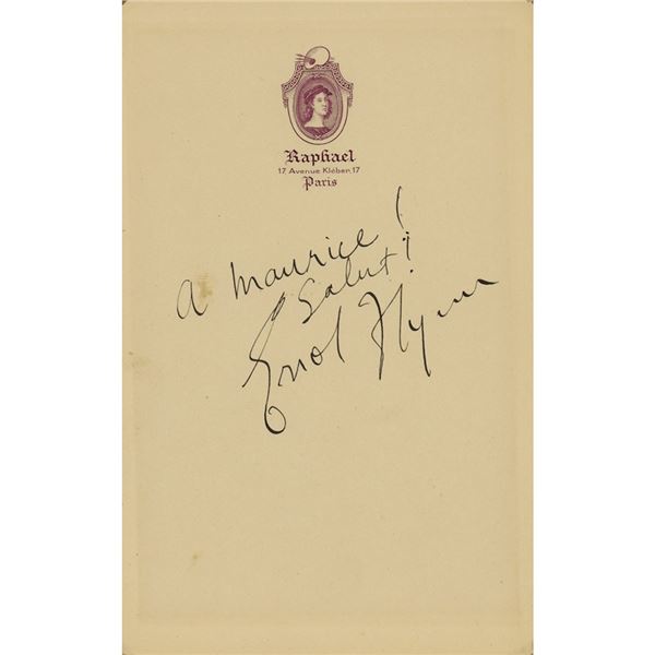Vintage fountain pen signature and inscription, "A Maurice! Salut! Errol Flynn,” on an off-white 4.5 x 7.25 sheet of stationery from the ...