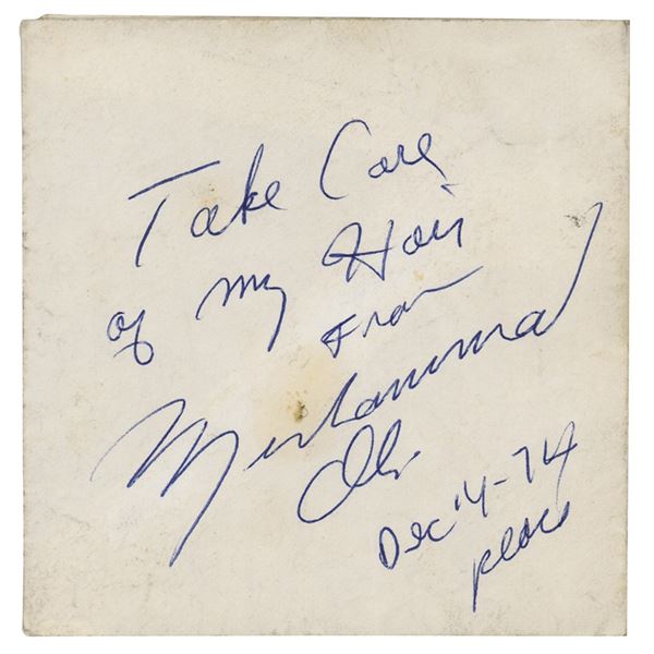 Ballpoint signature, "Take care of my hair, from, Muhammad Ali, Dec. 4–74, peace,” on a folded TWA envelope measuring 3.75 x 3.75. I