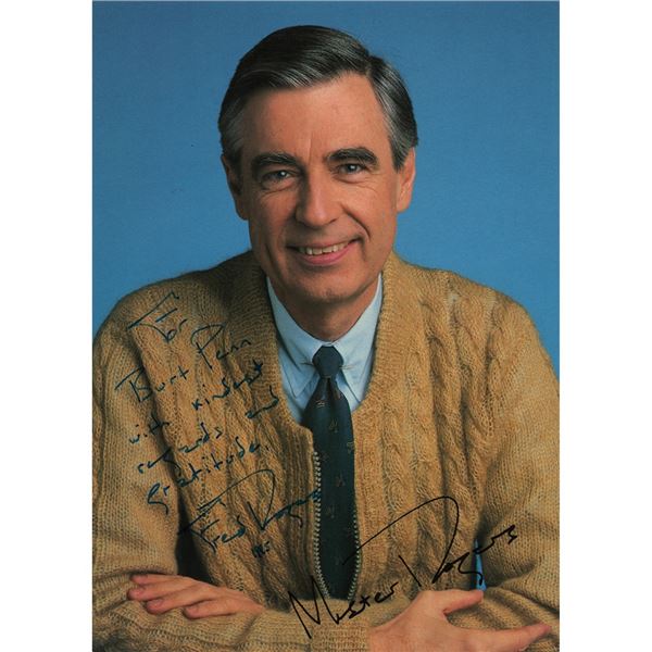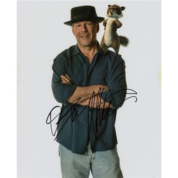 Color glossy 8 x 10 photo of Bruce Willis with RJ the raccoon from the 2006 animated film Over the Hedge, signed in black felt tip. In fine condition.
