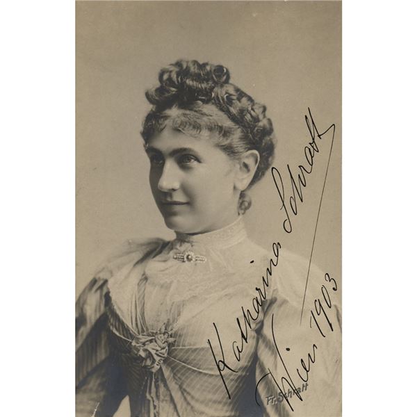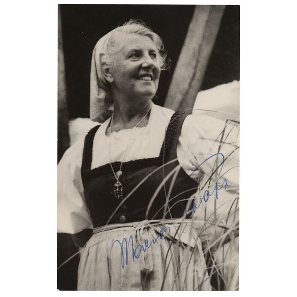 Vintage matte-finish 3.5 x 5.5 postcard photo of Maria Von Trapp, signed on the front in blue ballpoint, "Maria Trapp," and on the reverse...