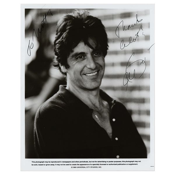 Glossy 8 x 10 Universal City Studios publicity photo of Pacino, signed and inscribed in black felt tip, "To Matt, Thanks a lot! Al Pacino.̶...