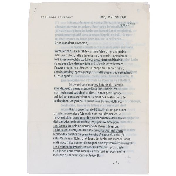TLS in French, four onionskin pages, 8.25 x 11.75, personal letterhead, May 21, 1980. Letter to Stanley Hochman, his American translator, discussing s