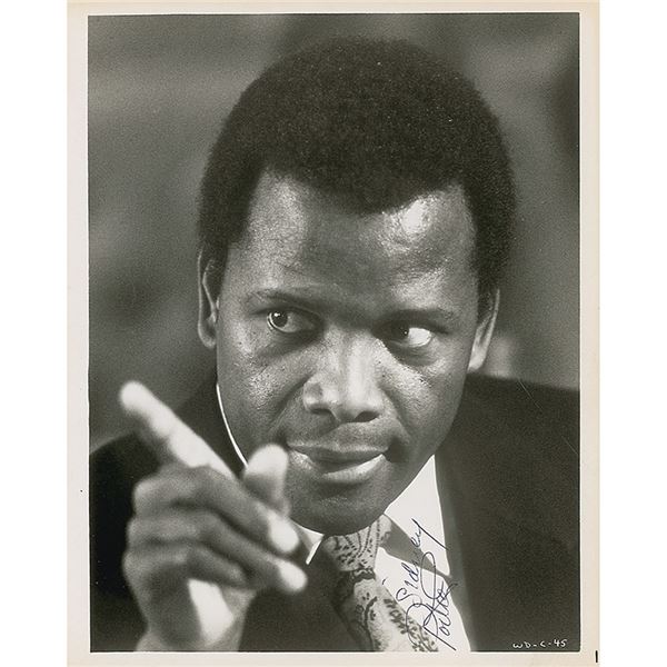 Glossy 8 x 10 National General Pictures promotional photo of Sidney Poitier as Dr. Younger in A Warm December, signed in black ballpoint. In fine cond