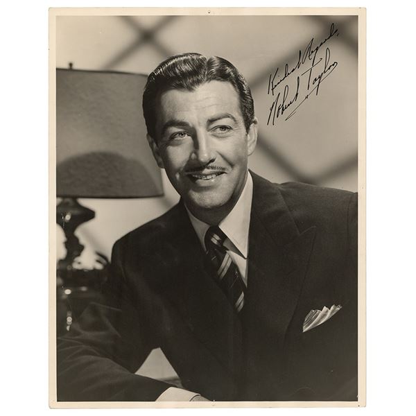 Vintage matte-finish 11 x 14 portrait of the exceedingly handsome Taylor in a suit and tie, signed in bold fountain pen, "Kindest Regards, Robe...