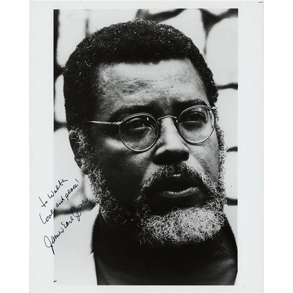 Glossy 8 x 10 headshot photo of the distinguished actor, signed and inscribed in black felt tip, "To Walter, love and peace! James Earl Jones.