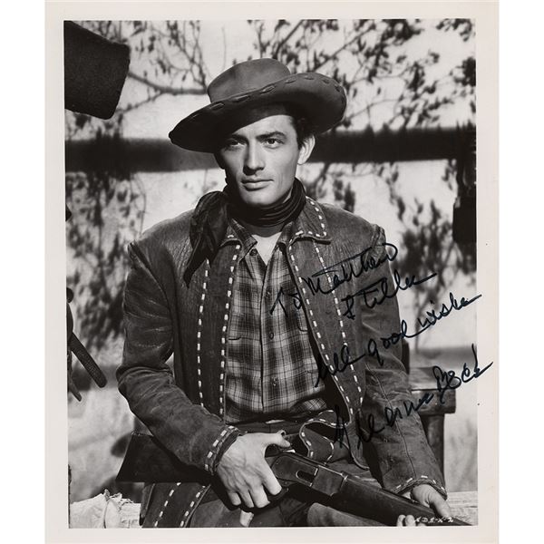 Sharp glossy 8 x 10 photo of Gregory Peck dressed in Western gear and holding a rifle, signed and inscribed in black felt tip. In fine condition.
