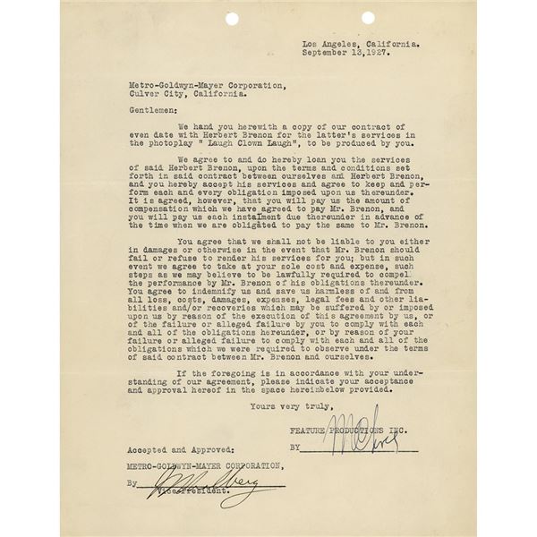 DS, signed “I. G. Thalberg,” one page, 8.5 x 11, September 13, 1927. Document by which Thalberg confirms MGM's receipt of Herbert Br