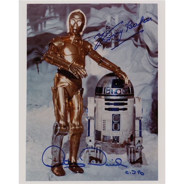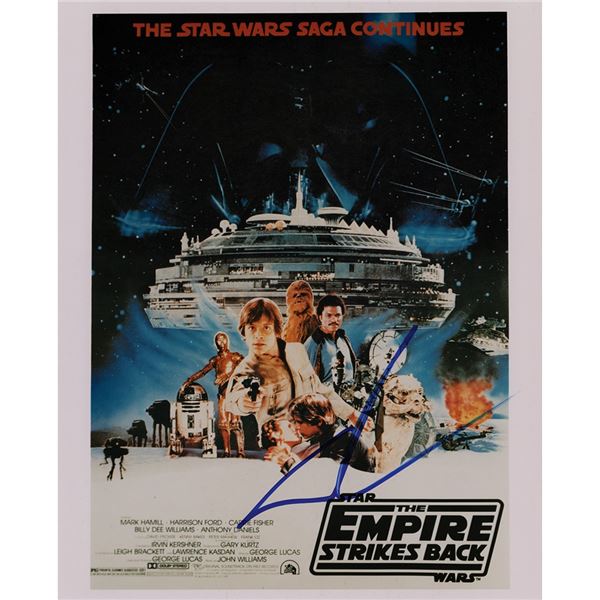 Color glossy 8 x 10 photo of the poster for The Empire Strikes Back, signed in blue felt tip by Star Wars creator George Lucas. In fine to very fine c