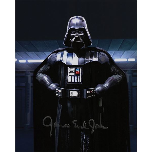 Color satin-finish 8 x 10 photo of Star Wars' iconic antagonist Darth Vader, signed in silver ink, "James Earl Jones." In fine conditi...