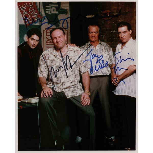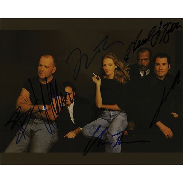 Glossy 10 x 8 photo of the Pulp Fiction cast, signed in felt tip by Bruce Willis, Uma Thurman, Samuel L. Jackson, John Travolta, and Quentin Tarantino