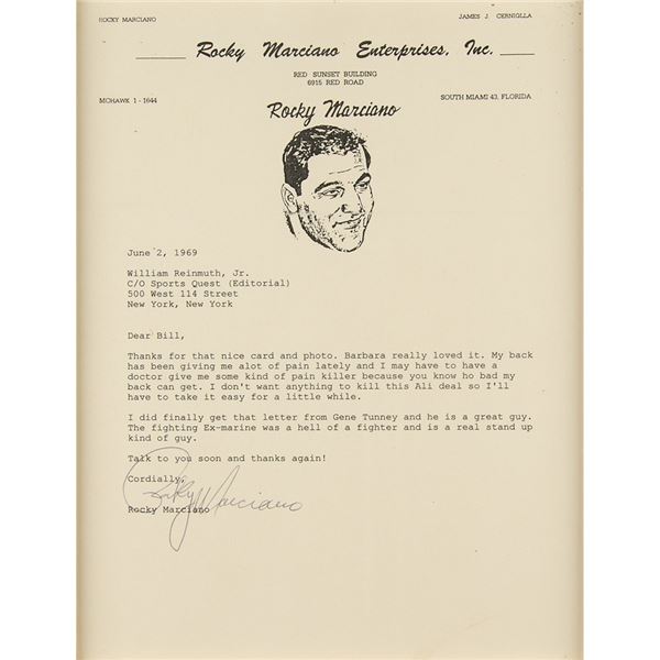 TLS, one page, 8 x 10.5, illustrated Rocky Marciano Enterprises, Inc. letterhead, June 2, 1969. Letter to William Reinmuth, Jr., of Sports Quest, in f