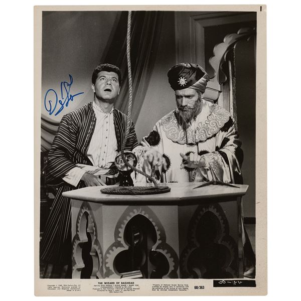 Glossy 8 x 10 publicity photo of Dick Shawn as Genii-Ali Mahmud in the 1960 film The Wizard of Baghdad photo, signed in blue felt tip. In fine conditi