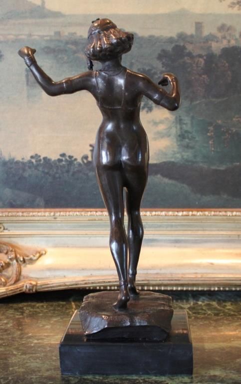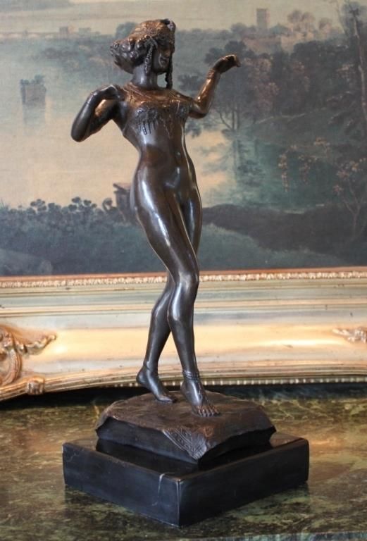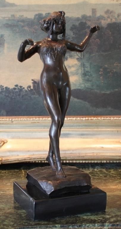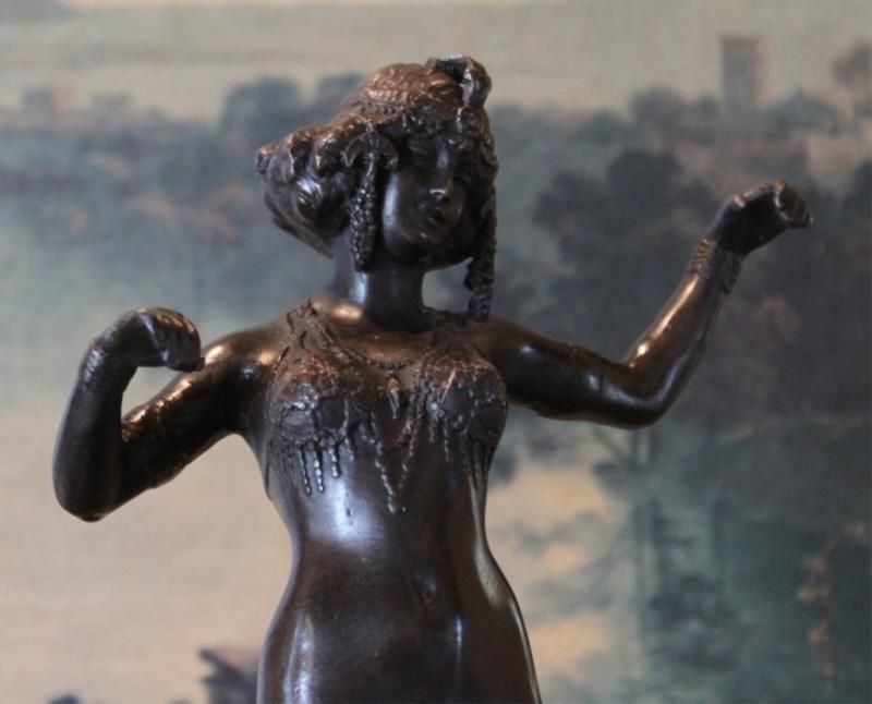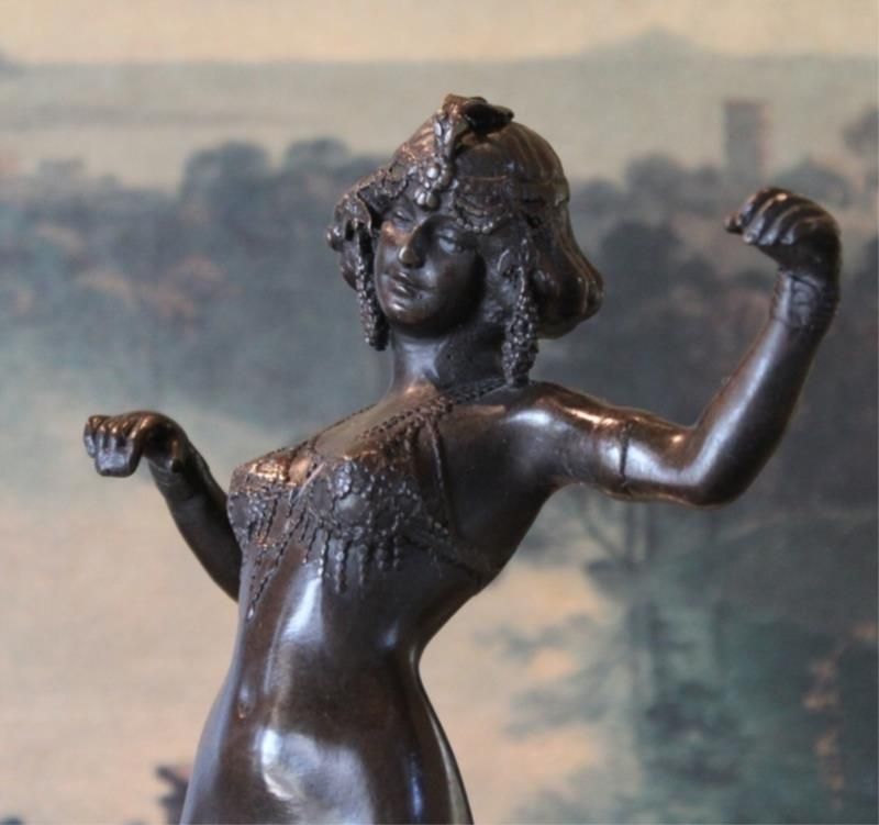 Fine Belly Dancer Bronze Sculpture 13 1/2H x 5W x 5D 12lbs. This bronze sculpture was produced using the "Lost Wax" casting method. The "Lost Wax" Cast method is the most precise metal casting technique in existence, ensuring exquisite detail of the original host model which is usually sculpted in clay or wax. This "Lost Wax" casting method is an extremely labor intensive and expensive process, but the end results produce a Heirloom Quality Masterpiece!