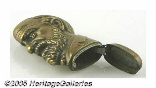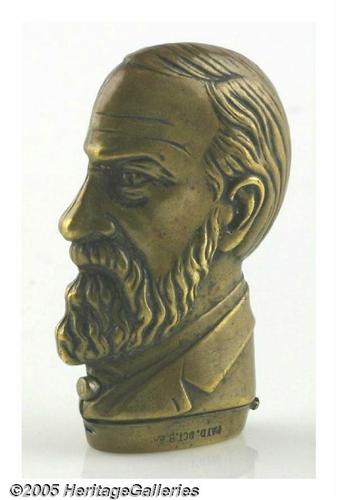 <B>Fine Benjamin Harrison Brass Pocket Match Safe</B></I> Also made in a Grover Cleveland version for his Democratic opponent, and dated 1888, so clearly a campaign issue. Excellent example, with rich patina and complete with the often-missing hinged lid and spring locking mechanism at the bottom. 1.5" x 2.5". Lot:260