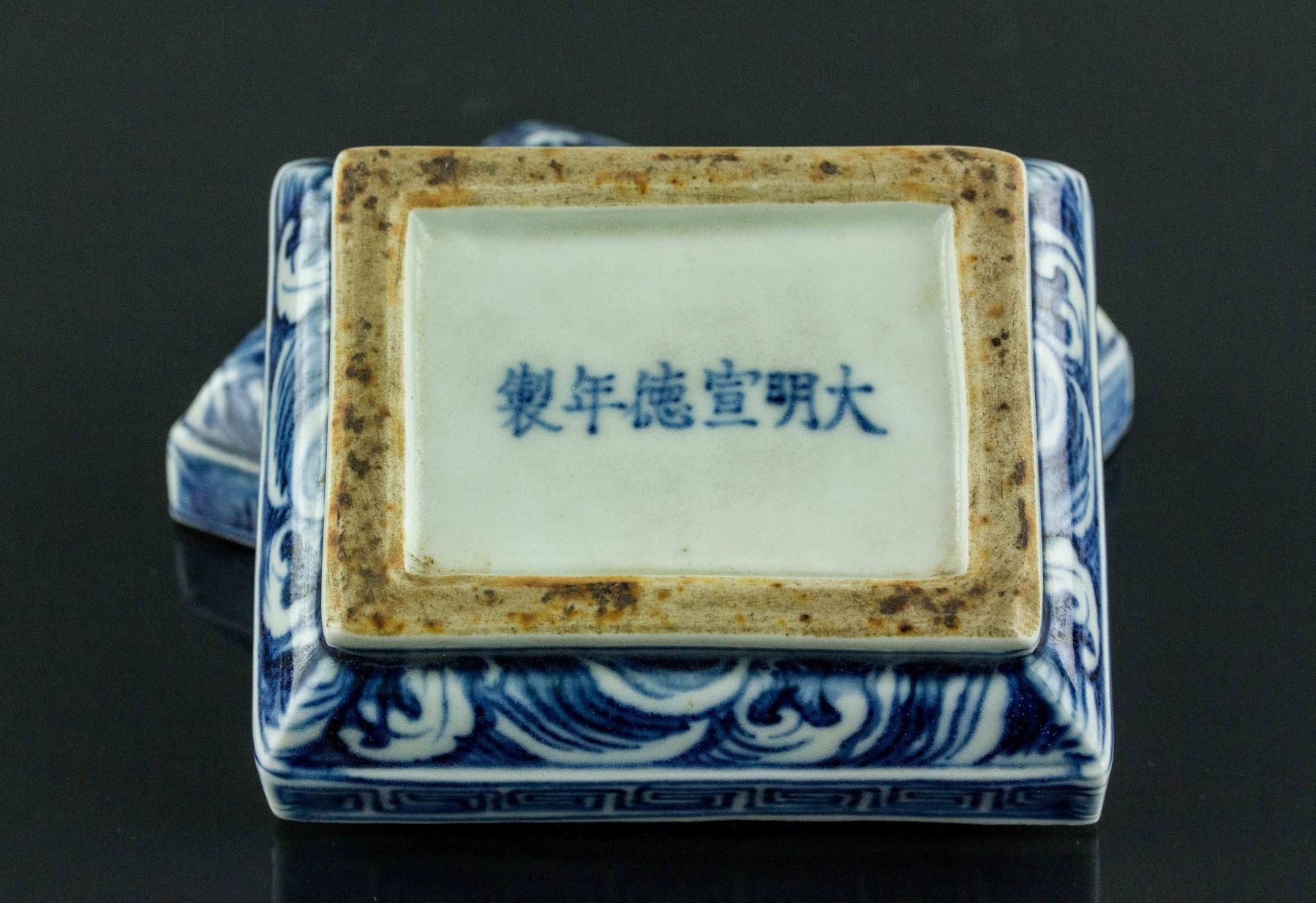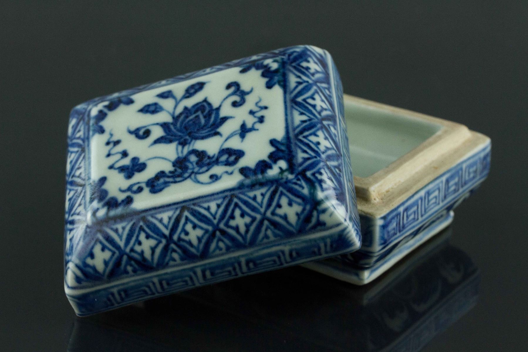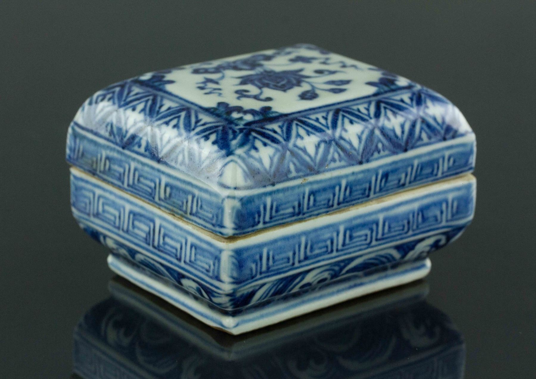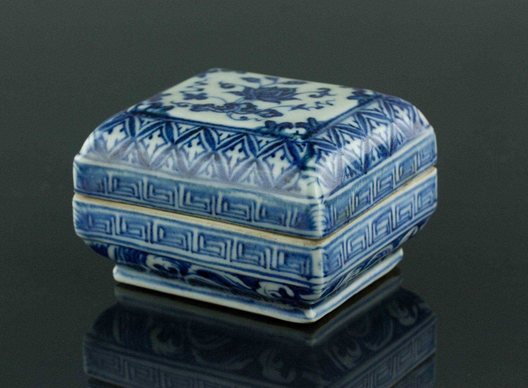 Chinese fine blue and white porcelain cosmetic box; of square section with short foot rim; painted with panels of lotus sprays and decorated with key-fret bordering; six-character Ming Xuande mark on base; H: 5 cm, L: 9 cm, 282 grams. PROVENANCE: Private collection, Circa 1980 (Nagoya, Japan)