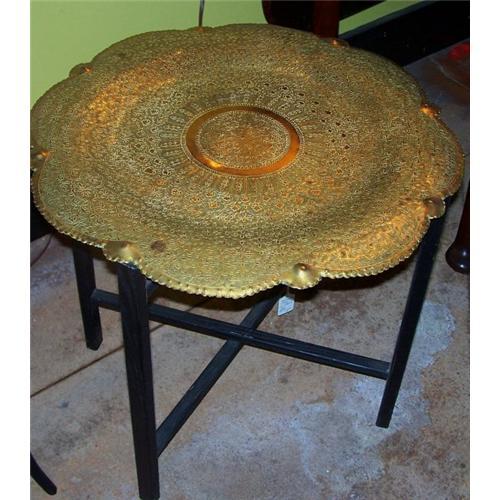 Offered here is a most attractive Middle Eastern tray on a stand. The tray has a great deal of hand work, in fact the entire surface is covered in fine detail, giving the tray a lacey look. It's really quite nice. The tray sits on what I call an X stand, that folds flat for storage. The tray is 20" in diameter. On the stand it is approximately 18" high. The tray probably dates to around 1930-1940, and is in excellent condition.