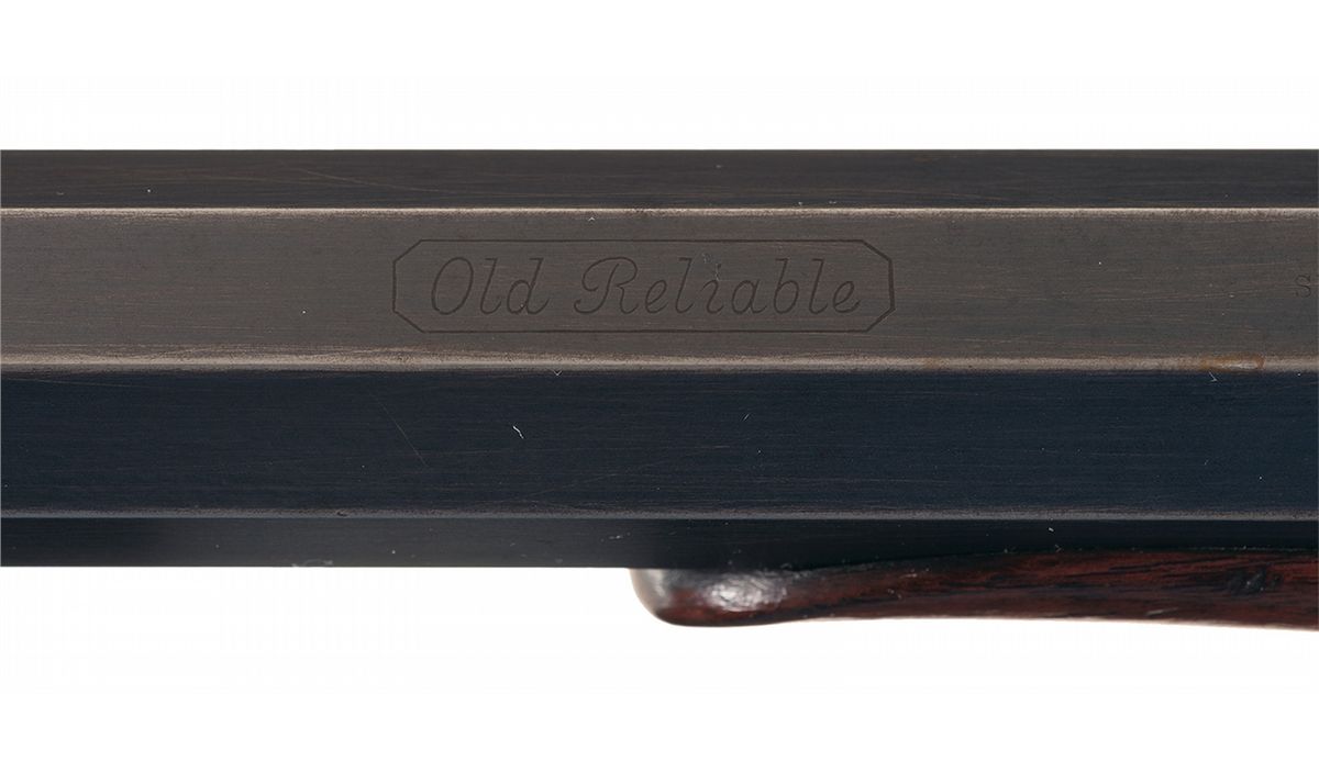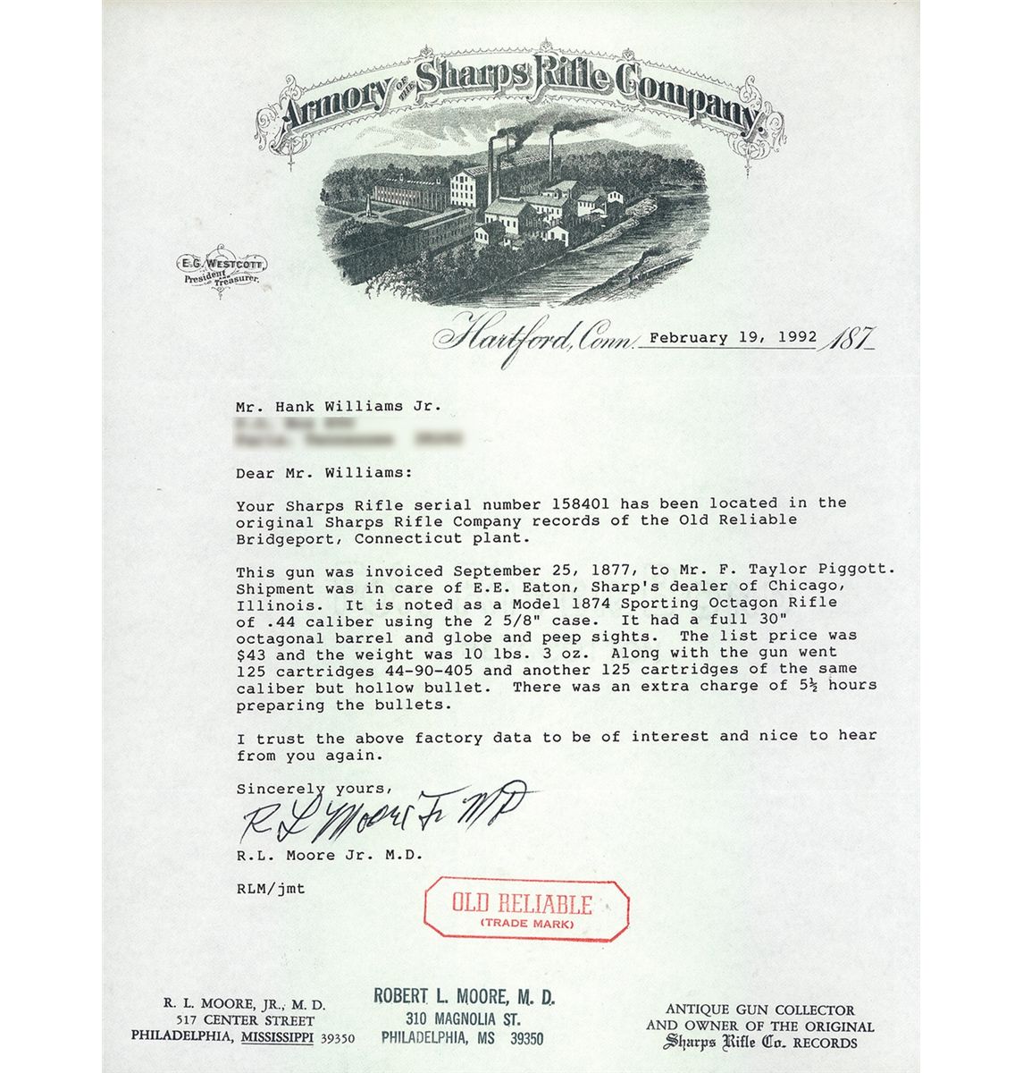 This is a fine example of a documented Sharps Model 1874 Sporting Rifle. This particular rifle was manufactured in 1877. The top barrel flat is marked "Old Reliable" in a box, "SHARPS RIFLE CO. BRIDGEPORT. CONN." ahead of the rear sight and "CALIBRE 44" at the breech, with "2 5/8" on the right flat near the breech with a "7" stamped over it. The left side of the receiver is marked "SHARPS RIFLE CO/PAT APR 6 1869" the lock is unmarked and the serial number is marked on the top of the receiver. Blade front and ladder style rear sight absent of yard graduation markings, tang mounted mid-range peep sight, single trigger, blue barrel and casehardened remaining parts, and mounted with smooth forearm and straight grip stock with a checkered iron buttplate. The accompanying factory letter addressed to Mr. Hank Williams Jr., Paris, Tennessee verifies the serial number, 30" octagon barrel, 44 caliber, globe and peep sights, that 250, 44-90-405 cartridges were sent with the gun which was shipped to a Mr. F. Taylor Piggott, care of E.E. Eaton, a Sharps dealer in Chicago, Illinois on September 25, 1877.