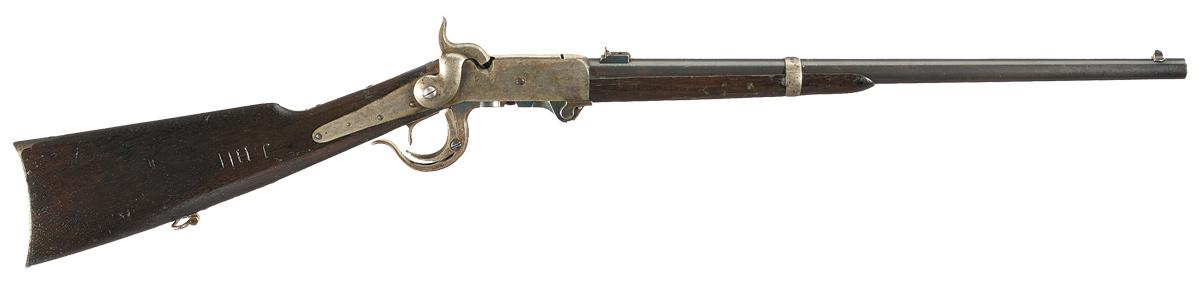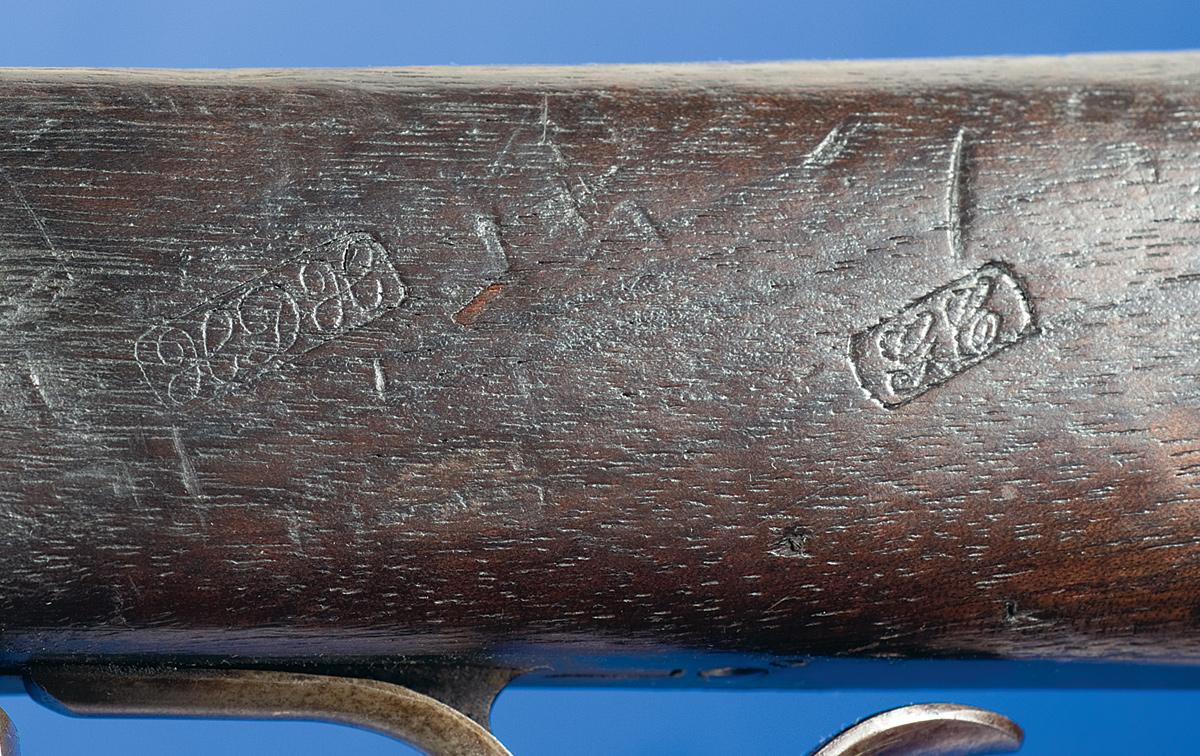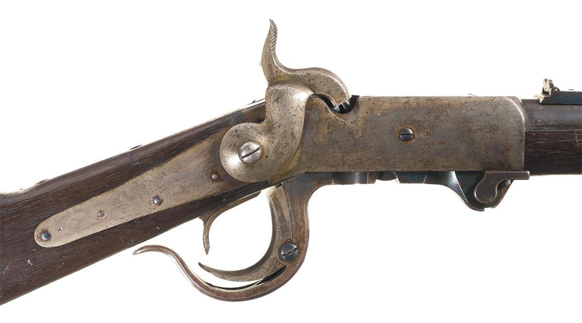 Condition: Very fine. The barrel retains 70% slightly faded original blue with some thinning and a few minor nicks. The receiver and lock plate retain approximately half of its original faded case colors. The breechblock retains 95% of the original bright original blue finish while the lever and hammer retain original case colors in protected areas being mostly a gray-brown patina. The wood is near excellent with light handling and use marks in the stock with a series of bruises on the forearm and carries a dark hand worn, oiled patina. Mechanics are excellent.