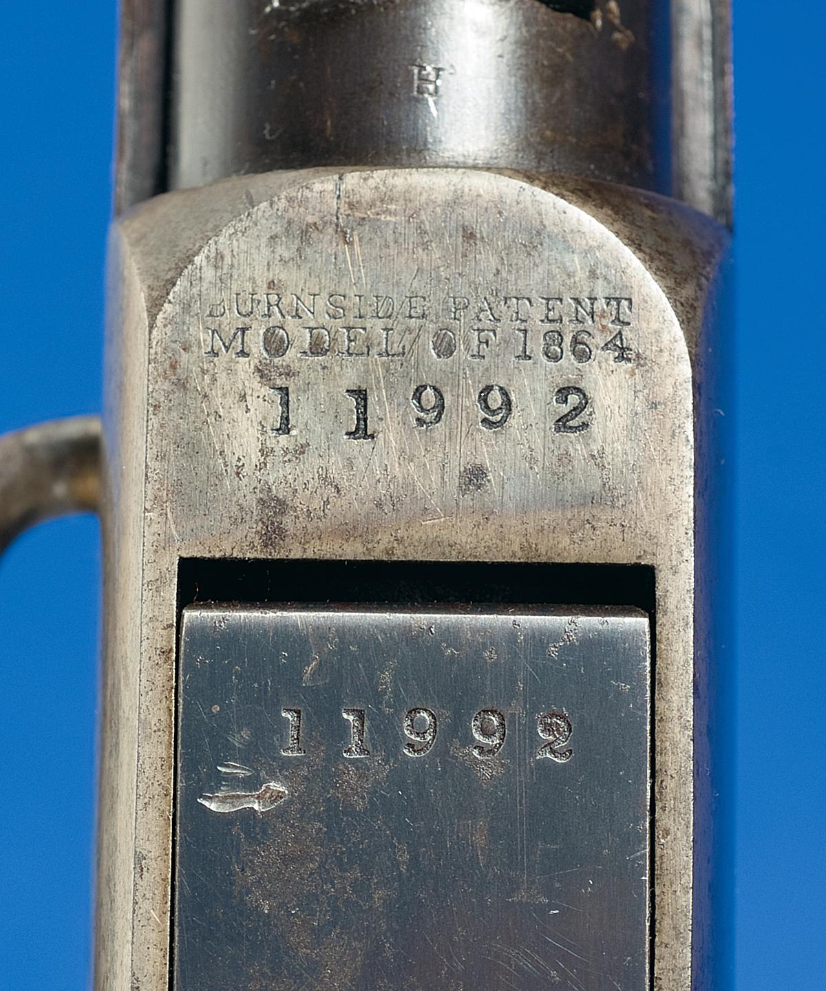 Fifth model Burnside carbine manufactured from 1863 to 1865. The 5th Model differs in that it has a guide screw in the center of the right side frame allowing smoother operation as the breech rides in a corresponding groove in the breech block. The barrel was blued and fitted with a two-leaf, folding rear sight graduated to 500 yards. The buttplate, receiver, hammer lever and barrel band have a casehardened finish. The barrel tang, trigger guard, and breechblock had a high polish niter finish. The forend and stock are black walnut. The frame and lock plate have the standard two line Burnside marks including the 1856 patent date. There is a saddle ring bar and ring mounted on the left side of the receiver. The top of the barrel is stamped "CAST STEEL 1864" ahead of the rear sight. The serial number "11992" is located on the top of the frame and breechblock. Small "H" sub-inspector's markings are stamped on small components. Two clear script Ordnance inspection marks are stamped on the left stock wrist. A crude "JH" has been carved into the right side of the stock.
