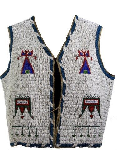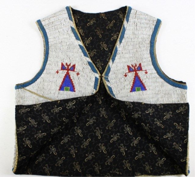 on native tanned leather sinew sewn. White field background, edges trimmed in light translucent blues with teepees and geometric patterns in white centered reds, medium blue, greens and greasy yellows. Vest lined in black patterned cotton cloth, thread stitched around perimeter, all show very good to fine condition. Est. 4000-6000