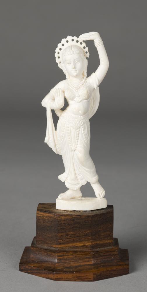Finely carved to depict a goddess with hands positioned and halo, mounted on a sectional wood carved plinth. 5.5" H, circa early 20th Century.