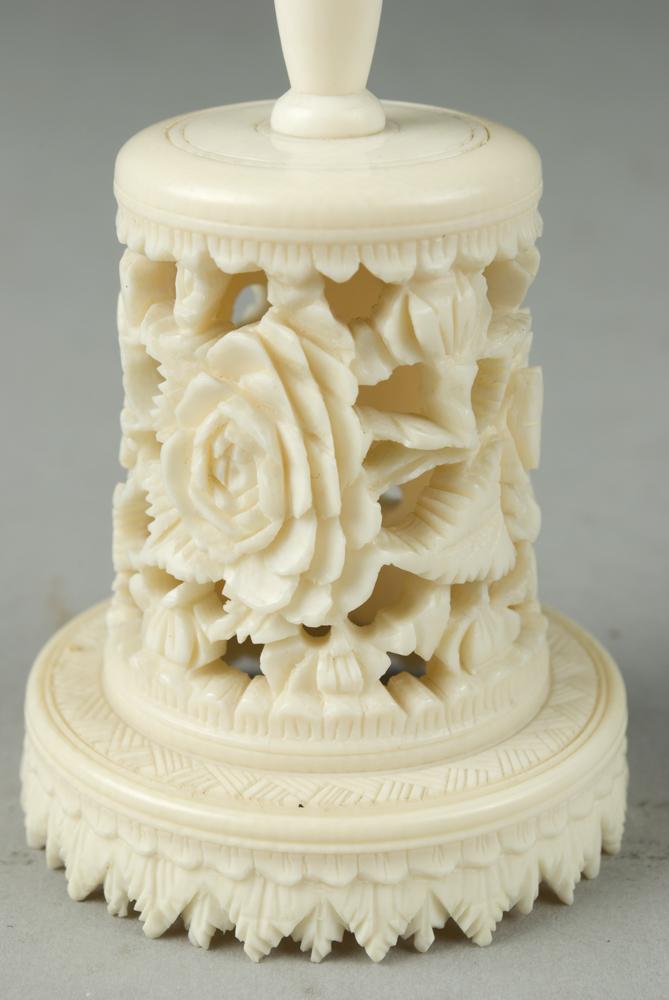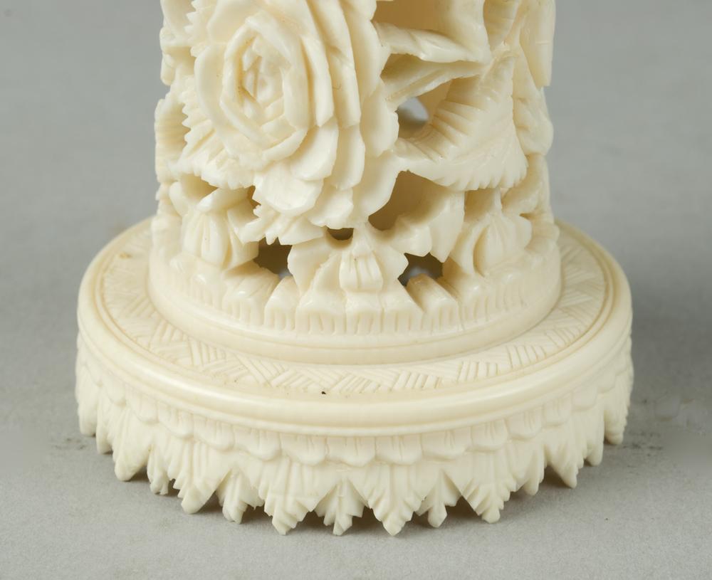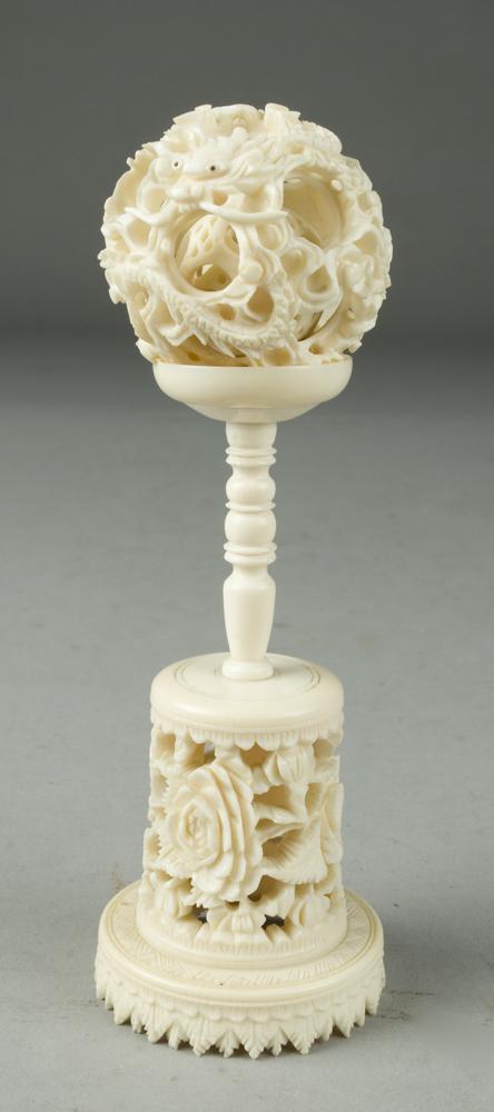 The ball finely carved to depict dragons chasing a pearl, the stand carved with flowers and leaves, with central carved shaft, 5.5"H, 19th, early 20th century.