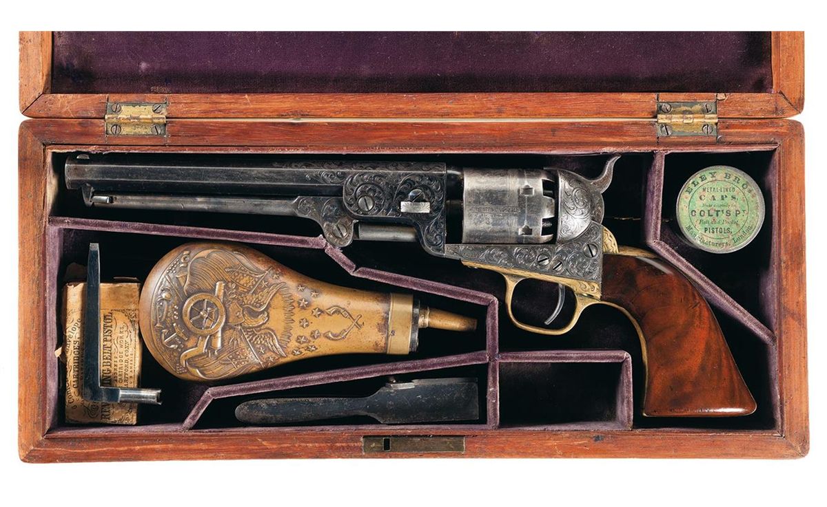 Very fine. The revolver retains at least 70% of the original blue and 50% casehardened finish. The barrel has most of the high polish blue remaining with light finish wear at the muzzle and edges. The cylinder retains 40% of the original blue finish with 95% of the battle scene visible. All of the cylinder pins are intact and flash pitting on the nipples and rear face of the cylinder is minimal. The loading lever, frame and hammer retain 90% plus original bright case colors. The trigger guard and back strap have a very pleasant mellow aged patina with traces of original silver plating in the protected areas. The engraving is deep and crisp. All of the markings are sharp. The grip has had varnish added with nearly all of the period applied high gloss varnish remaining, showing some light storage and handling marks. The action is fine. The exterior of the case is excellent showing only minimal storage and handling wear. The velvet lining is very good. The lining on the lid shows minimal contact wear. The lining in the case is slightly faded and has compression marks and oil stains from the revolver cylinder and some minor tears from the front sight blade. The flask, mold, tool and cap tin are all very good with moderate wear. The cartridge packet has been opened but retains the original cartridges. This is a very fine example of a cased factory Gustave Young engraved Colt Model 1851 Navy Revolver.