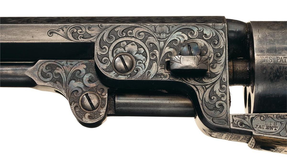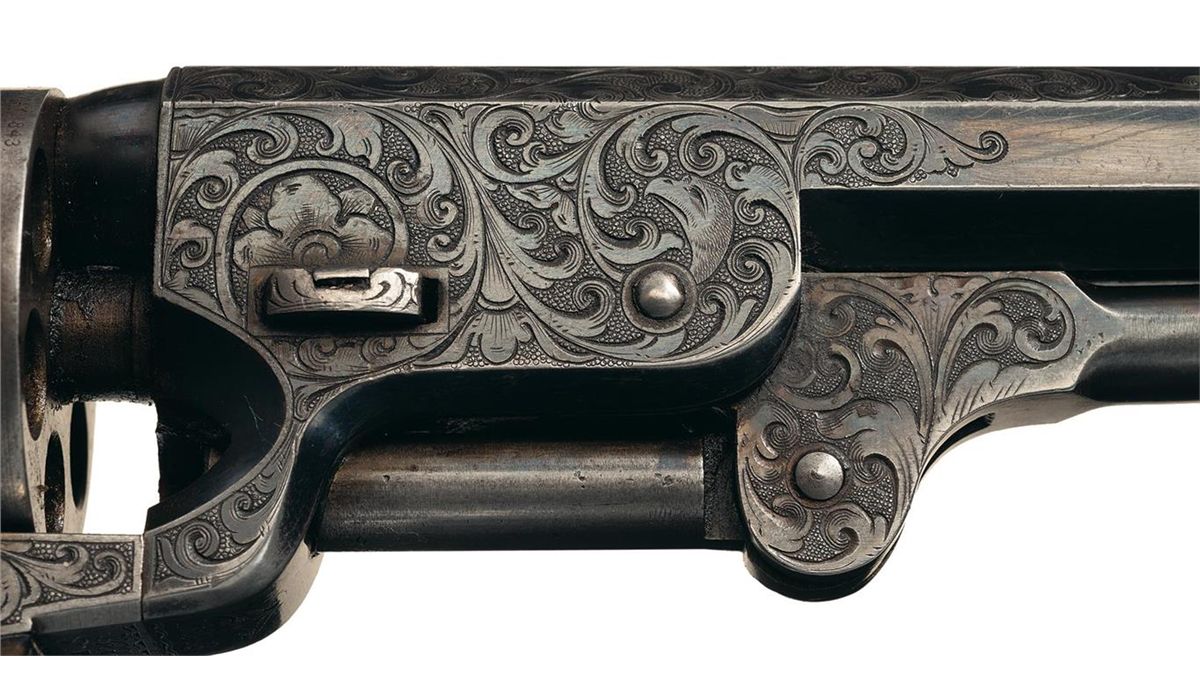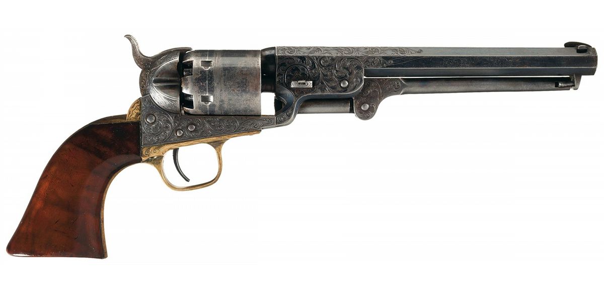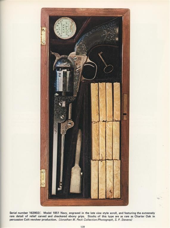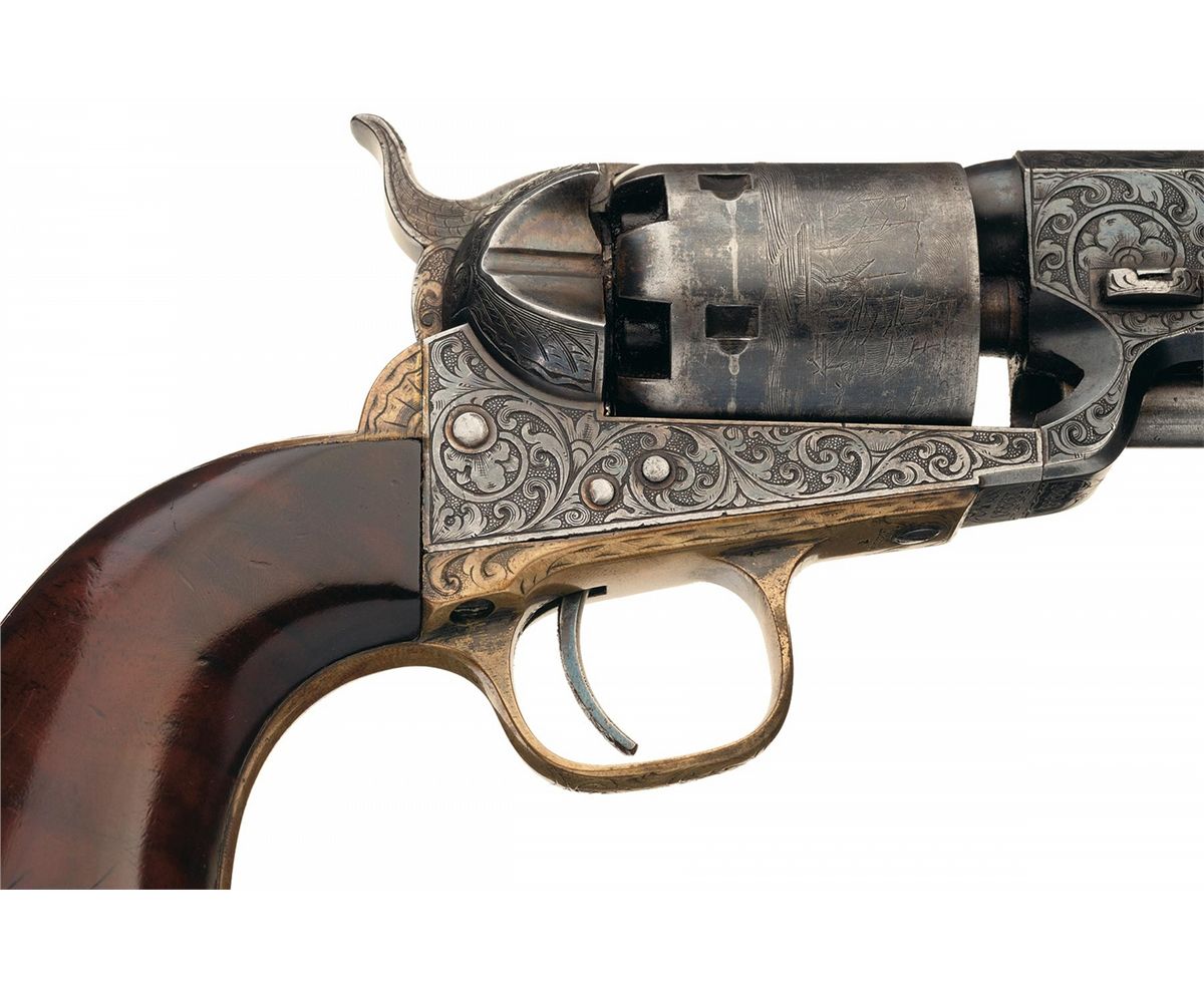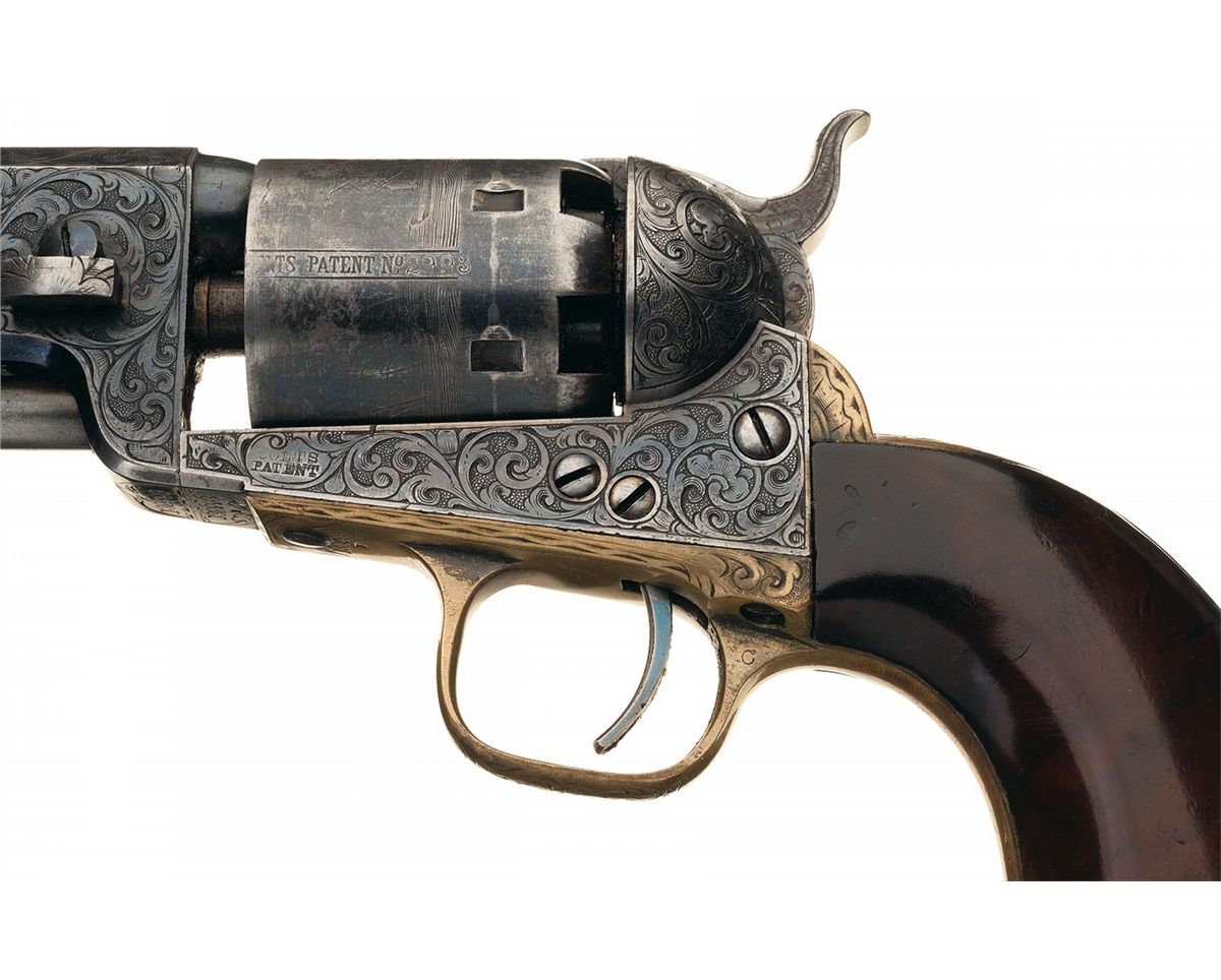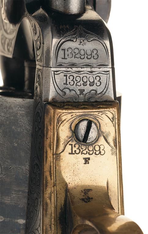 This is a very nice example of a factory engraved Colt Model 1851 Navy revolver manufactured in 1862. This 4th Model Navy Revolver has the characteristic large round trigger guard, capping channel in the recoil shield cut-out and thin contour loading lever catch. The barrel is fitted with German silver front sight blade mounted in a dovetail at the muzzle. The top barrel flat is marked "-ADDRESS COL. SAML COLT NEW-YORK U.S. AMERICA-" in an engraved panel and "COLTS/PATENT" is stamped on the left side of the frame surrounded by engraved scroll work. The cylinder is roll-engraved with the Texas Navy battle scene and "COLTS PATENT No.2993". A "C" is stamped on the left rear of the trigger guard bow and an "E" is stamped above or below the serial number which indicates the revolver was designated for special finish or engraving at the factory. The complete serial number "132993" is located on the barrel, frame, trigger guard and back strap. The partial serial number "2993" is stamped on the loading lever and cylinder, and "32993" on the wedge and arbor pin. The revolver is factory engraved with Germanic scroll work on a punch-dot background by Master Engraver Gustave Young. The hammer is engraved with Youngs characteristic wolf head motif. The engraving is very similar to the embellishment on the Model 1851 Navy Revolver, serial number "132969/E", illustrated on page 139 of "THE COLT ENGRAVING BOOK", Volume One by R.L. Wilson and described by Wilson as "modified Gustave Young scroll style". The engraving coverage is what Wilson describes as "Style number 2 engraving". The barrel and cylinder are finished blue, silver plated grip frame and casehardened remaining parts. The revolver is fitted with a smooth nicely figured fancy one-piece varnished walnut grip. The revolver comes in a factory English style mahogany case with five compartments and purple velvet lining. In the case is an Eley Bros. cap tin (partially full), blue iron double cavity bullet mold for balls and conical bullets marked "D" on the bottom of the right leg, combination nipple wrench/screw-driver, brass American Flask & Cap Co. Coat of Arms pattern powder flask with fixed charger embossed with crossed revolvers, stars, eagle with crossed flags and a cannon and a package of combustible envelope cartridges, (partially open).