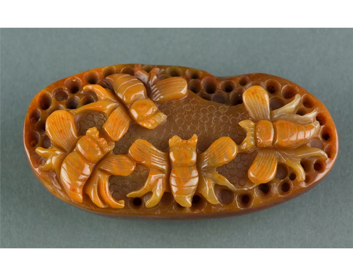 Fine Chinese Agate carved bee hive and four bees. The stone of honey tone. H: 9 cm, W: 4.5 cm, L: 3.2 cm, 194 grams. Provenance: T. Ng Collection Toronto.