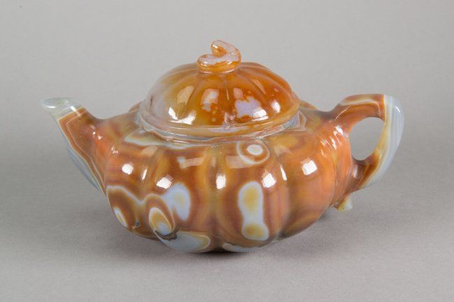 Fine Chinese agate carved tea pot; of lobed pumpkin form; H: 10 cm, W: 20 cm, 1019 grams