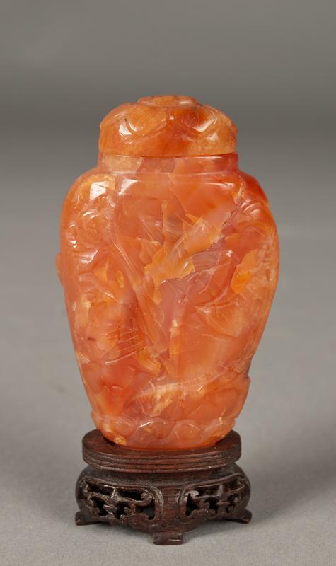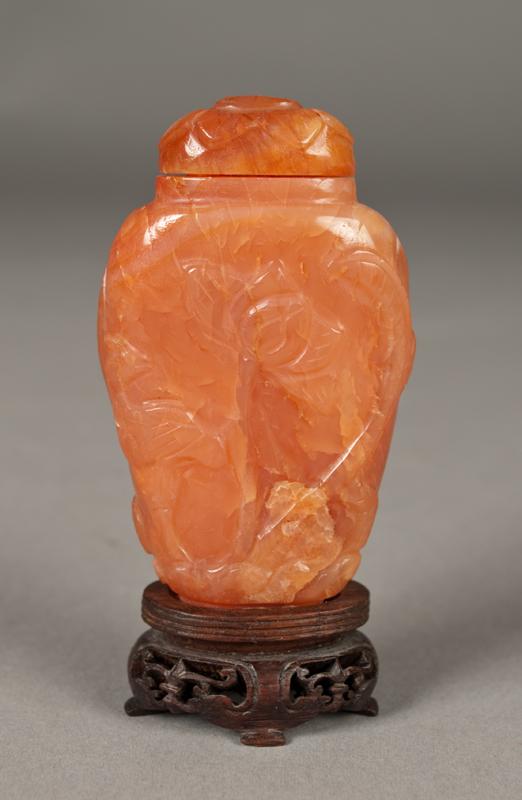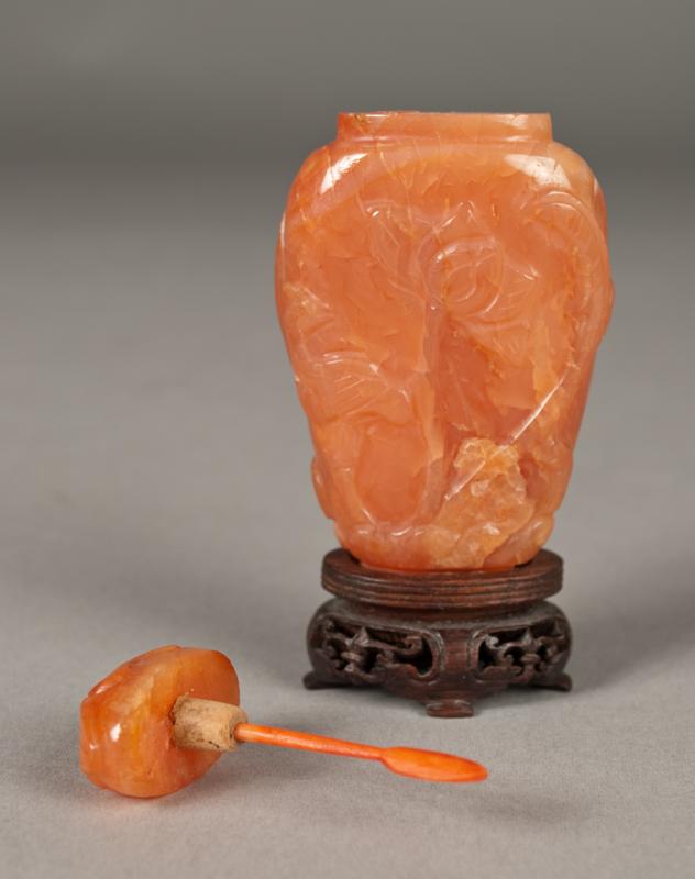 Finley carved on both sides to depict birds amongst foliage, with fitted carved wood stand, and possibly coral spoon, 3.25"H, including the stand, circa early 19th century, the stand 19th century.