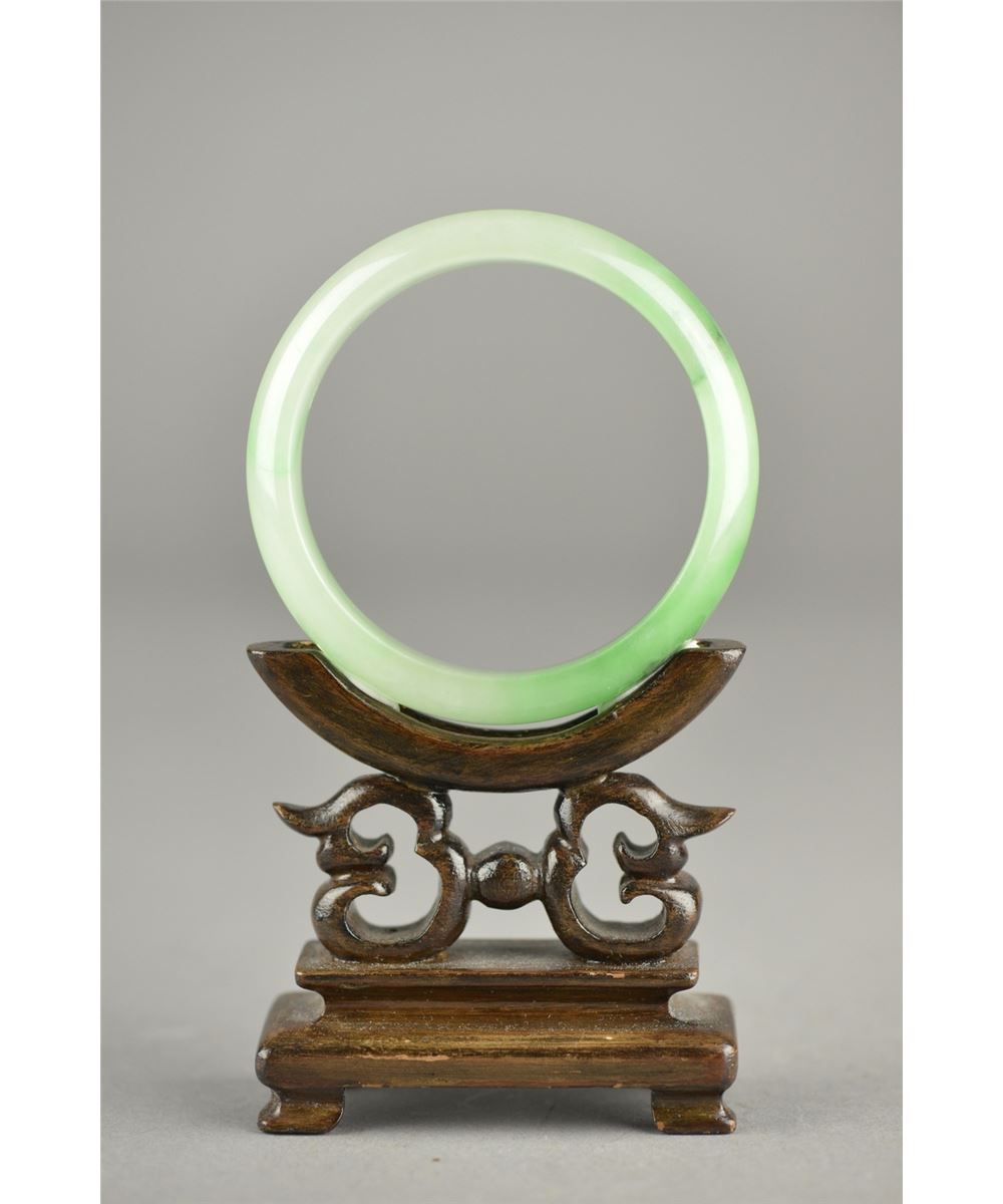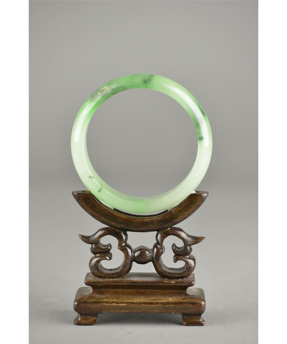 Fine Chinese carved jadeite bangle; the stone of translucent green tone with dark suffusions; D: 7 cm, D: 5.5 cm (interior diameter), 61 grams