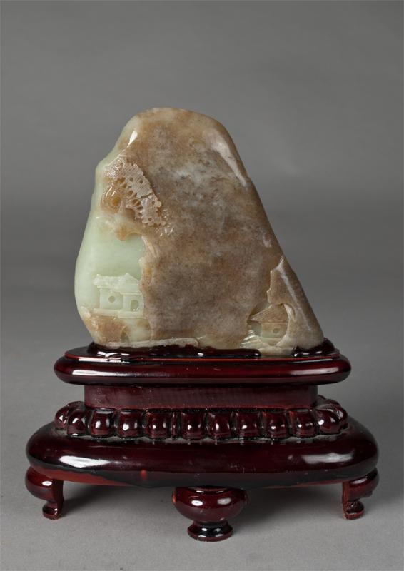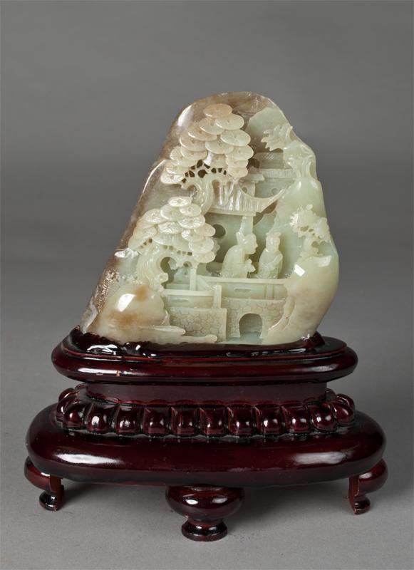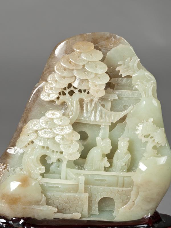 Heavy russet and celadon jade finely carved depicting two figures communicating on a bridge in front of a building, the reverse with back of building and bush carving. 7.25" H (measured with stand). 20th century.