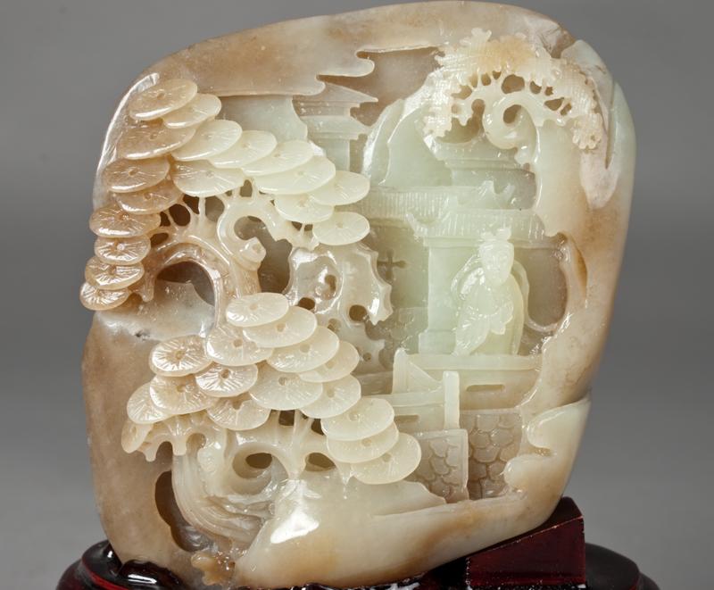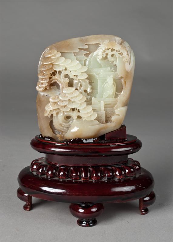 Heavy russet and celadon jade finely carved to depict a single figure in front of a building on what appears to be stairs, the reverse with back of building and bush carving. 6.75" H (measured with stand). 20th century.