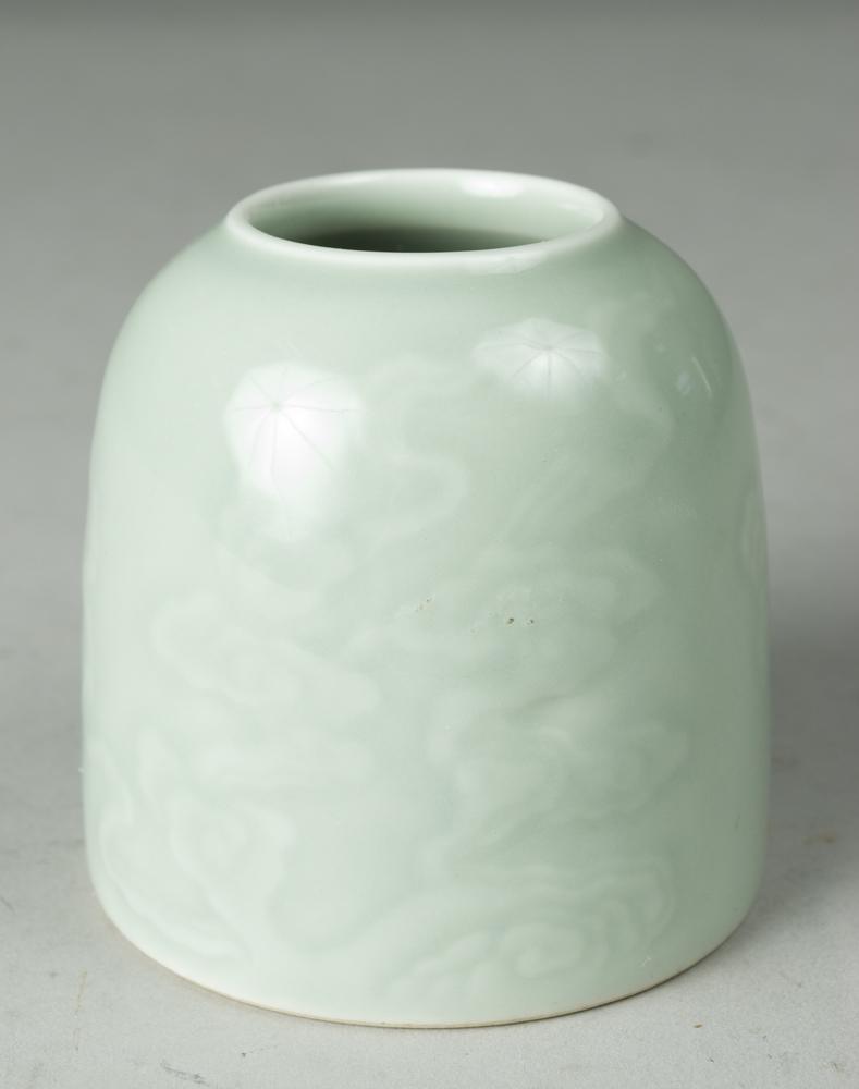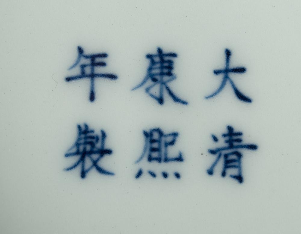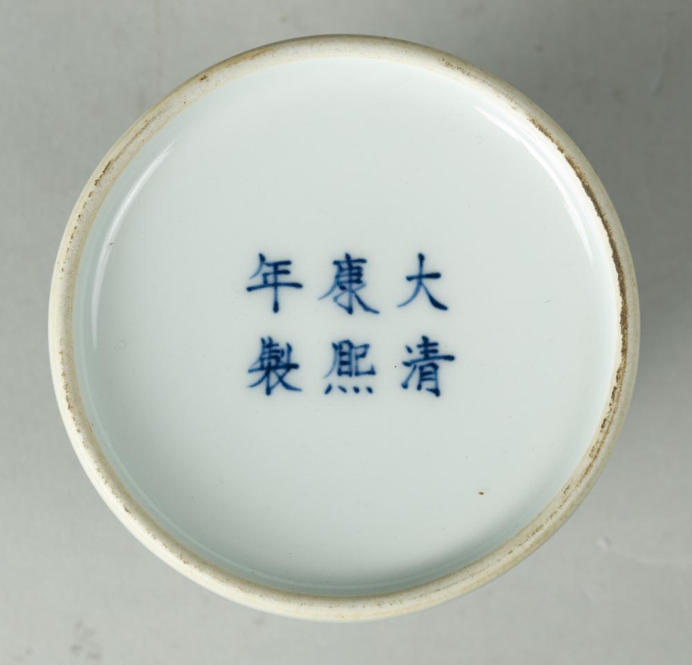 Decorated with raised tree and blossoms. Six character mark for Great Kangxi production in underglaze blue on bottom. 2 & 7/8" H x 2 & 7/8" W. Circa 19th/20th Century.