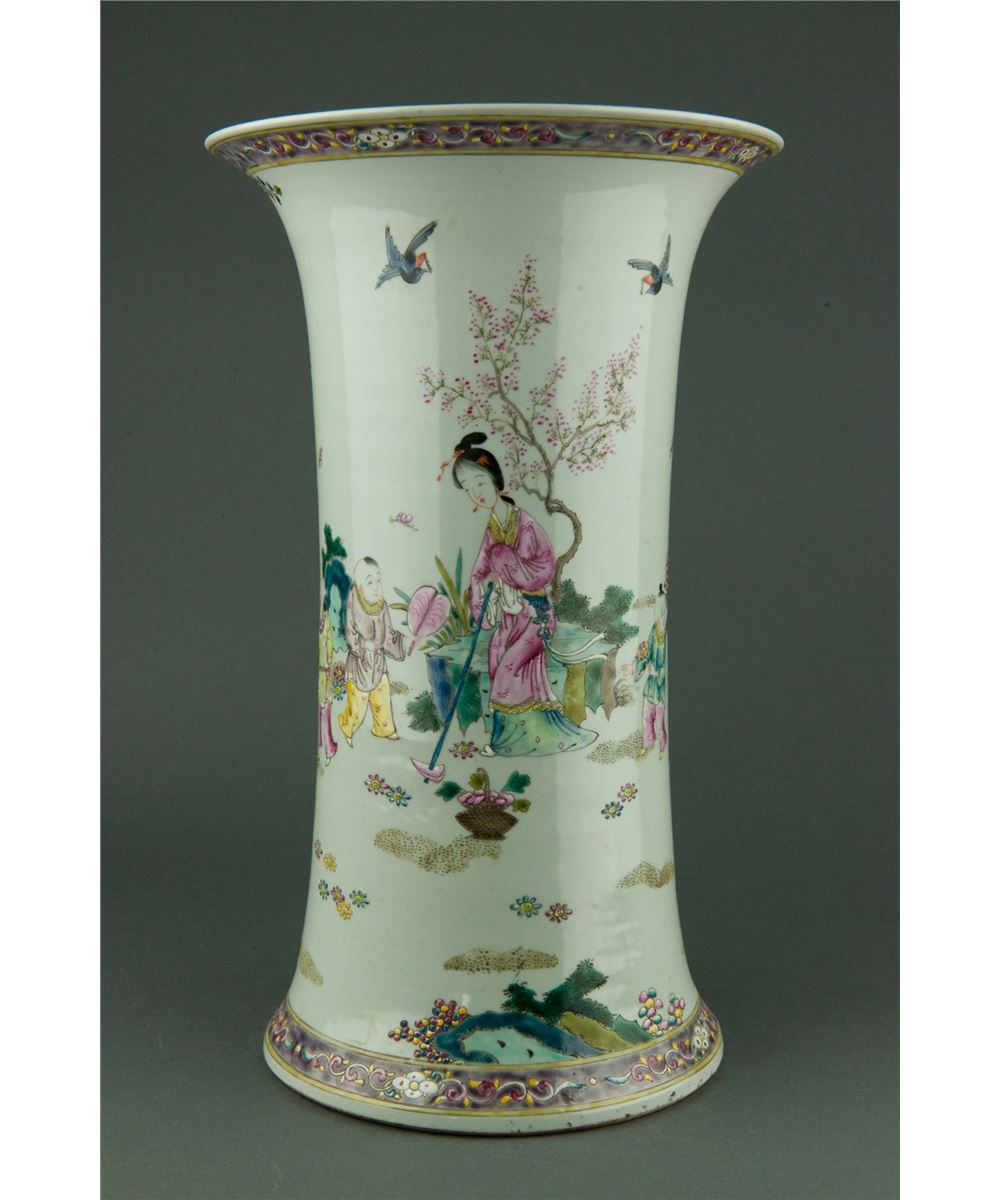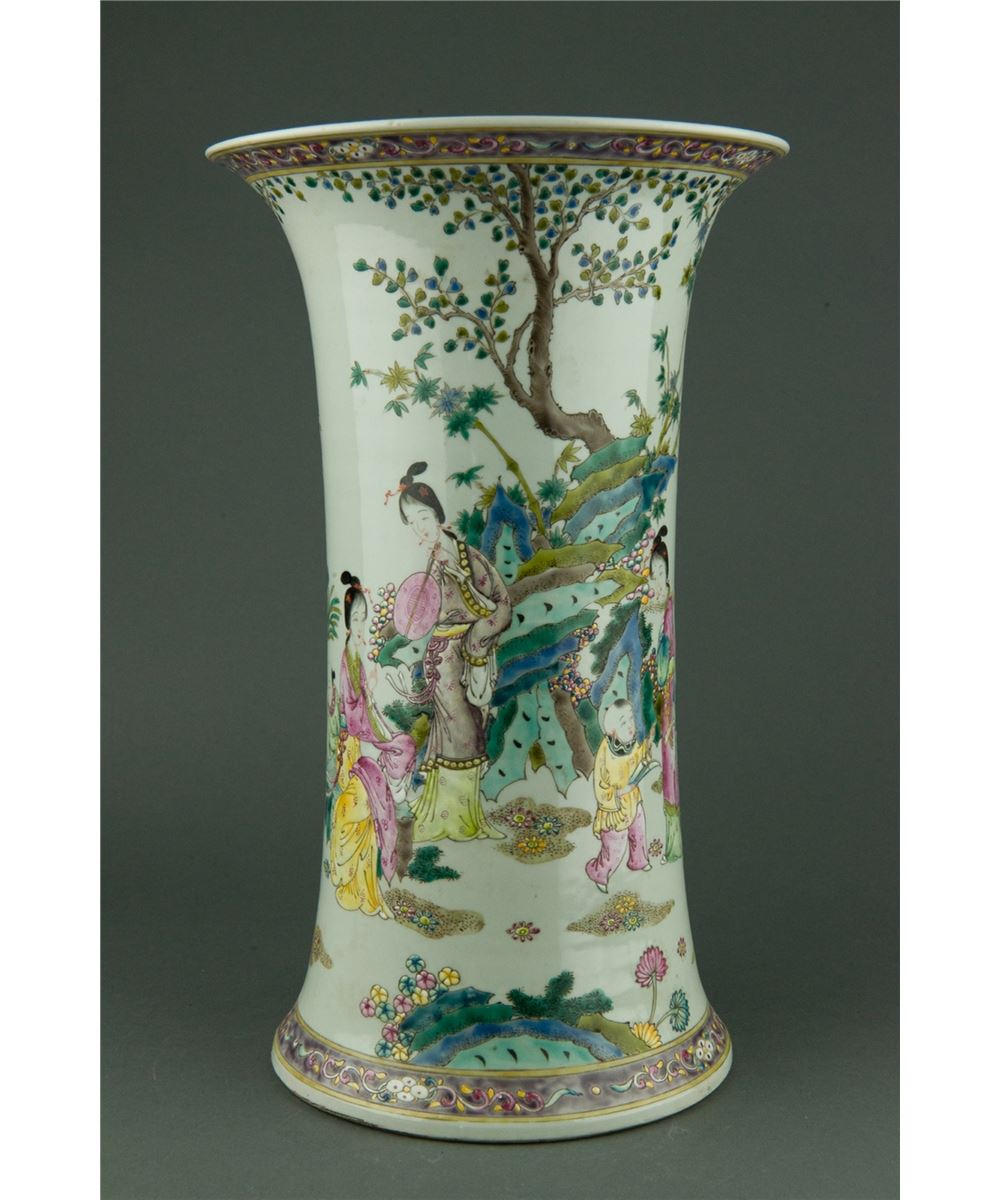 Tall Chinese Famille Rose Zun porcelain Vase, featuring cylindrical form covered with scenes of ladies in the courtyard between two scrolls painted foliages; mouth flaring up in trumpet like rim; H: 34.5 cm, D: 21 cm